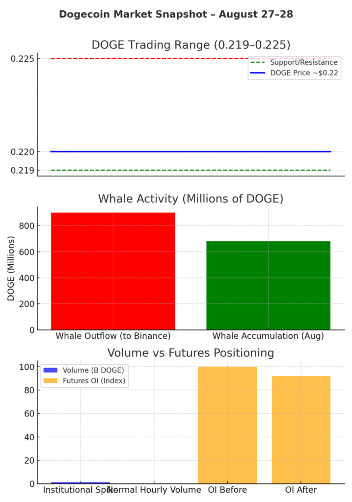 Aug. 27, 20:00 GMT: DOGE spiked from $0.219 → $0.224 on 1.26B volume — nearly 4x average hourly flows, signaling institutional absorption.
